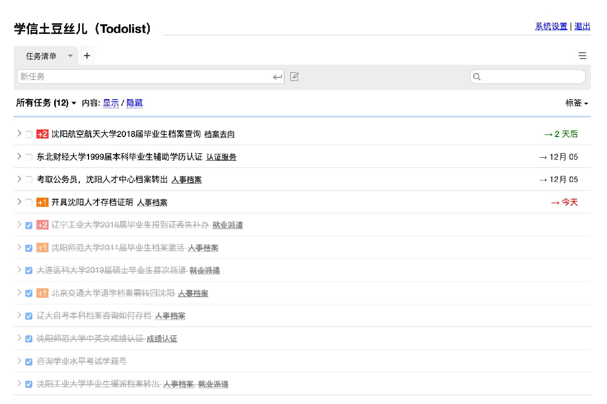 我們的開(kāi)發(fā)小組將這個(gè)功能取名為學(xué)信土豆絲兒(Todolist),非常接地氣,讓用戶(hù)服務(wù)更透明化,通過(guò)任務(wù)分解讓用戶(hù)隨時(shí)了解任務(wù)進(jìn)展和業(yè)務(wù)反饋情況,同時(shí)公開(kāi)的任務(wù)也有助于具有相似需求的用戶(hù)了解我們的工作機(jī)制,減少重復(fù)咨詢(xún)。