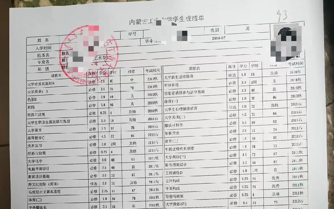 內(nèi)蒙古工業(yè)大學(xué)成績(jī)單案例