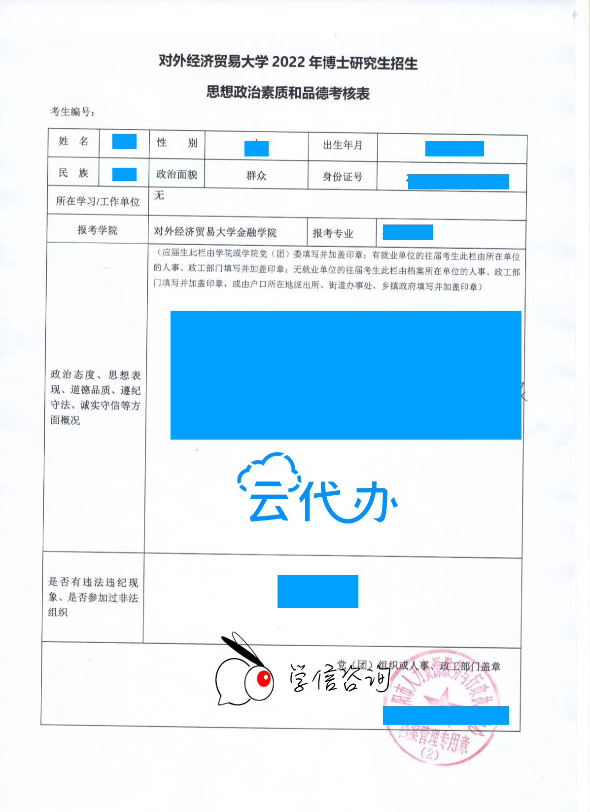 學(xué)信咨詢面向檔案保存在沈陽(yáng)市人力資源服務(wù)與行政執(zhí)法中心以及其他沈陽(yáng)各類公共人才中心的畢業(yè)生,提供研究生招生政審表(思想政治素質(zhì)和品德考核表)委托辦理政審及蓋章服務(wù)。