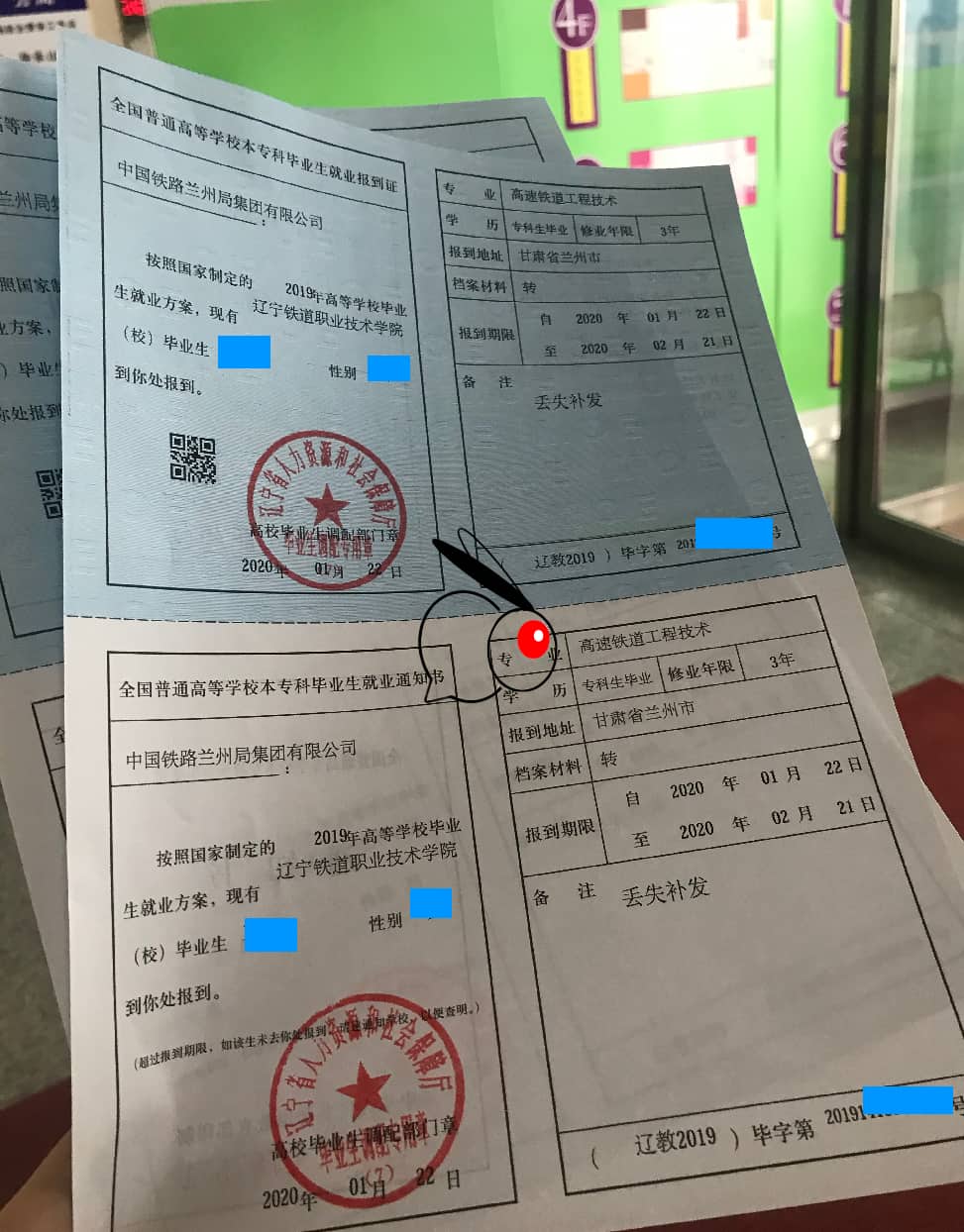 案例介紹:遼寧鐵道職業(yè)技術學院2019屆2位畢業(yè)生檔案到達用人單位后,單位人事發(fā)現(xiàn)檔案內(nèi)無就業(yè)通知書,但兩個畢業(yè)生手中都有報到證。臨近春節(jié),學校放假,通過學信咨詢協(xié)助補辦新的就業(yè)報到證和就業(yè)通知書,順利入職!