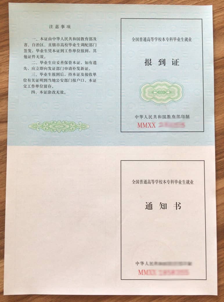 畢業(yè)前學(xué)校集中派遣,通常將已列入就業(yè)計劃的畢業(yè)生就業(yè)信息統(tǒng)一提交到省級就業(yè)派遣部門,然后批量審核后,集中打印就業(yè)報到證。在畢業(yè)生發(fā)放畢業(yè)證時,發(fā)放就業(yè)報到證。報到證分為上下兩聯(lián),下聯(lián)為白色的就業(yè)通知書也稱派遣證,存入畢業(yè)生學(xué)籍檔案。報到證顯示的就業(yè)去向和接收單位通常就是學(xué)校郵寄畢業(yè)生檔案的接收單位。另一個聯(lián)報到證聯(lián),本科、??粕鸀榈{色,研究生為淡粉色交給畢業(yè)生本人,用戶到用人單位報到或辦理畢業(yè)生落戶等事宜,畢業(yè)生應(yīng)妥善保存。